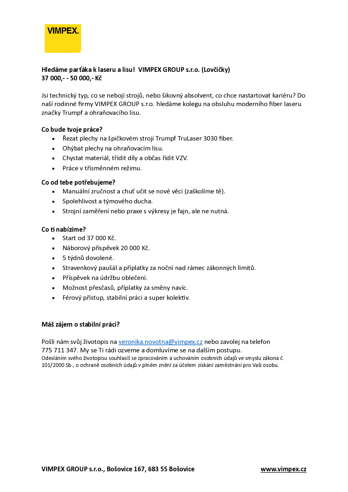 Společnost VIMPEX GROUP s.r.o. hledá do své provozovny v Lovčičkách nového kolegu na pozici obsluha laseru a ohraňovacího lisu. Hlavní náplní práce je obsluha laserového řezacího stroje, obsluha ohraňovacího lisu a manipulace s plechy a vypálenými díly. Bližší informace naleznete na www.vimpex.cz, popř. pište na Tato e-mailová adresa je chráněna před spamboty. Pro její zobrazení musíte mít povolen Javascript. nebo volejte na tel. číslo: 775 711 347.
