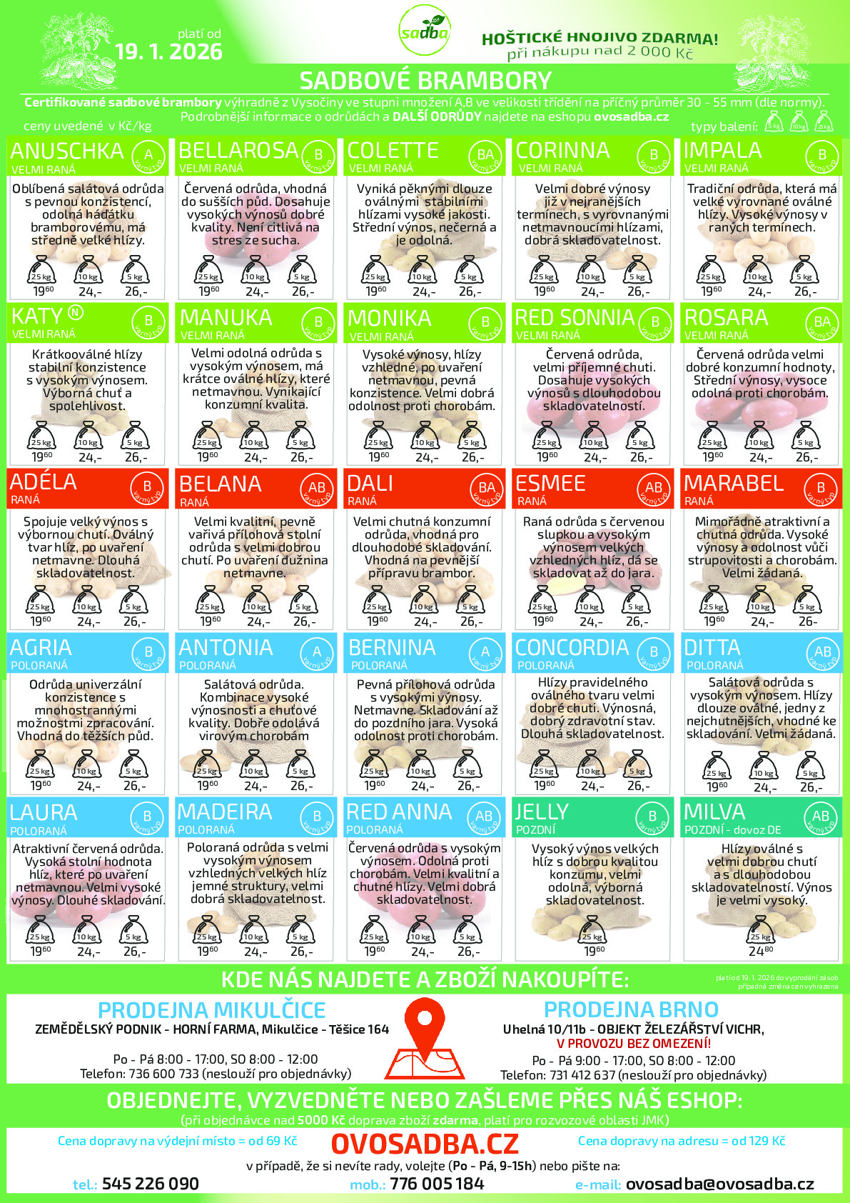 Firma OVO-SADBA Mikulčice oznamuje, že zahájila prodej sadbových brambor, hnojiv, substrátů a dalších potřeb pro zahrádkáře. V nabídce naleznete také zeleninová semínka, cibuli sazečku, postřiky a mnoho dalšího. Reklamní leták již naleznete také ve svých poštovních schránkách.