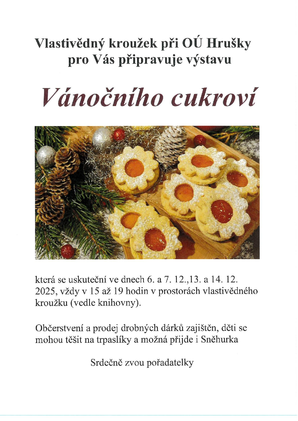 Spolek DRTICHY a OÚ Vás srdečně zvou na Vánoční veselení, které se koná již tuto sobotu 29. 11. 2025 od 14. hodin u Základní školy v Hruškách, vystoupí Mužáci z Hrušek, MŠ a ZŠ Hrušky, Hrušecká děvčata, Hrušečtí koledníci, Stacionář Vlaštovka Hodonín, Heriny Moravská Nová Ves a Amira Belly Dance Hrušky. Tradiční program zakončí ohňostroj. Doprovodný program v tělocvičně: výstava „Kouzlo vánoc“. Prodej občerstvení zajištěn.